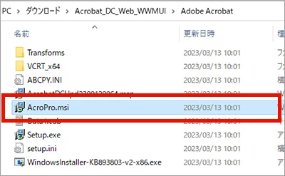 4. 展開した「Adobe Acrobat」フォルダ内にある「AcroPro.msi」を実行します。