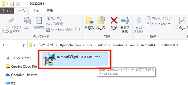 6. ダウンロードが完了した「AcrobatDCUpd1900820081.msp」ファイルを実行します。