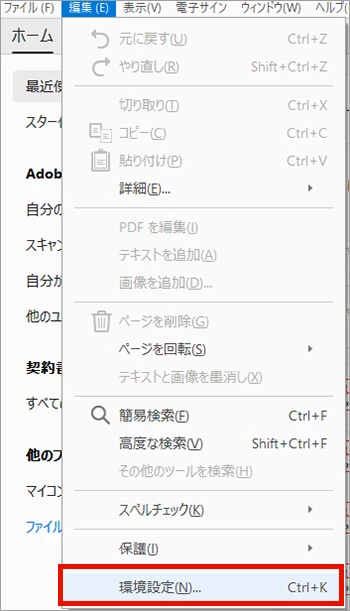 7. Acrobatを起動し速やかに [編集] - [環境設定] の順にクリックし、手順9の方法でアップデート抑止設定を行います。※時間が経過すると自動的にアップデートされる可能性がございます。