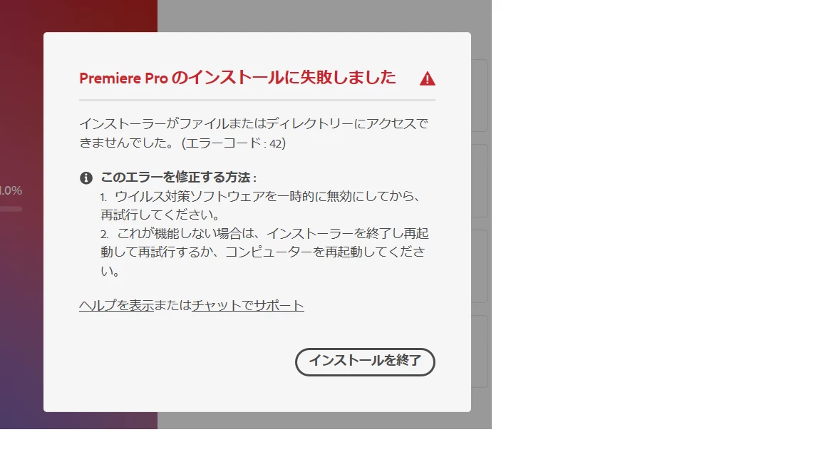 今回新しくパソコンを購入し、初めてPremiere Proをインストールしようとしたのですが、インストールの際に、「インストーラーがファイルまたはディレクトリーにアクセスできませんでした。[エラーコード42]」と表示され、インストールができない状態です。