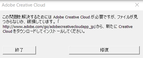 すると 【この問題を解決するためにはAdobe Creative cloudが必要ですが、ファイルが見つからないか、破損しています。