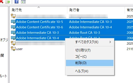 ③ 右側のペインで、「Adobe Intermediate CA」「Adobe Content」で始まるすべての証明書を選択して削除します。削除できたら、証明書マネージャーは終了します。