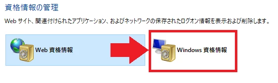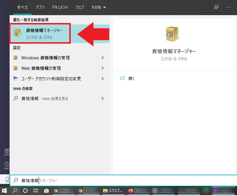 Windows の検索窓で「資格情報」と入力し、検索結果に表示された「資格情報マネージャー」を実行します。