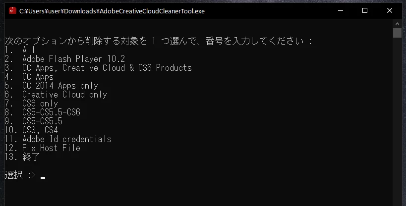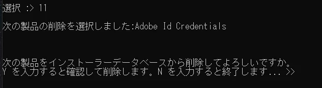 ⑤下記の画面が表示されたら、「Adobe Id credentials」に対応する番号を入力し、〔Enter〕キーを押します。