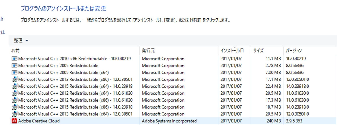 アドビクラウド240mb その他 マイクロソフトビジュアルc++ といったプログラムが10個ほどインストールされています。