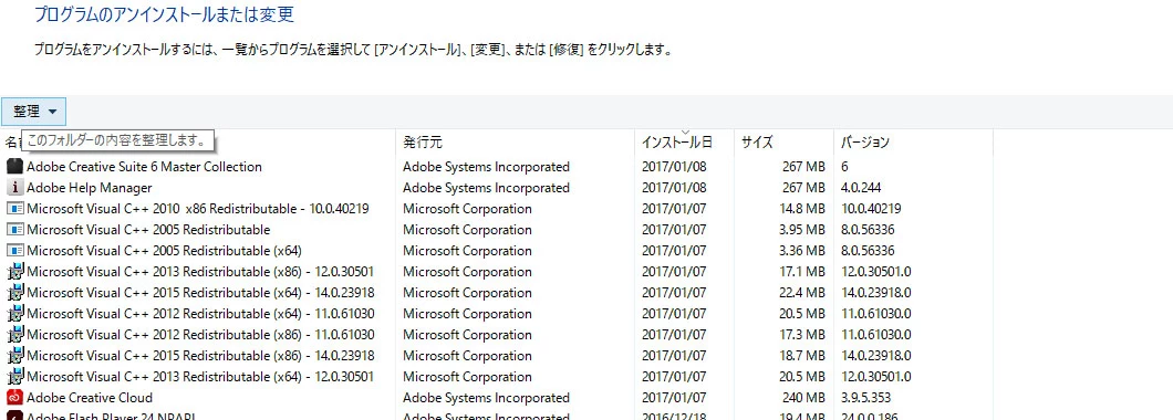 プログラムの追加・削除の10個を消してしまってCS6のパッケージ版に不具合が起きたりすると困りますし、念のために