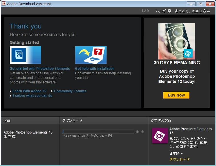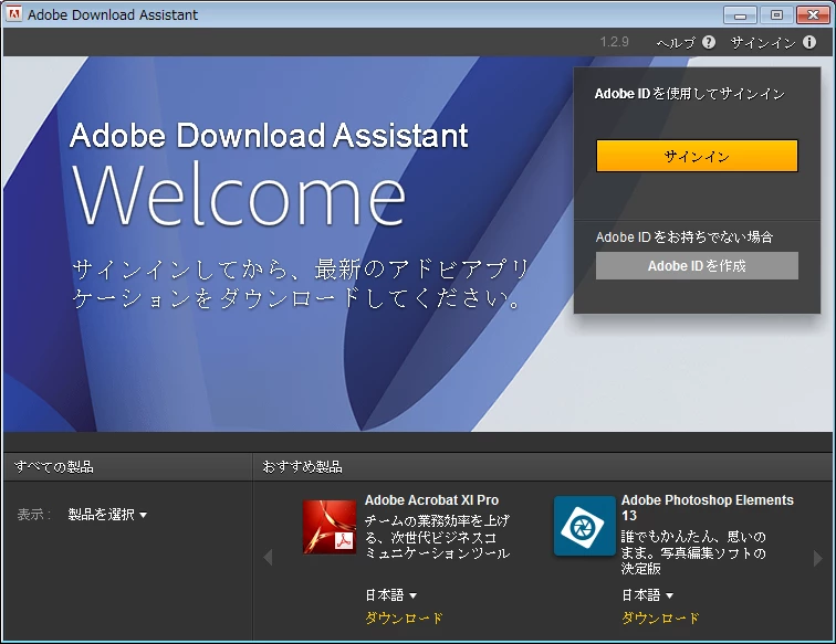 サインインが終わりましたら下段のAdobe Photoshop Elements 13 の「ダウンロード」を選択します。