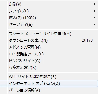 02: Internet Explorerを起動し、右上の歯車マークからインターネットオプションを選びます。