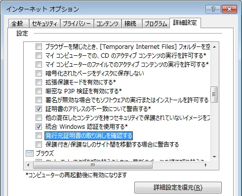03: 詳細設定タブのセキュリティセクション「サーバーの証明書失効を確認する」「発行元証明書の取り消しを確認する」にチェックが入っている場合は、チェックをはずします。