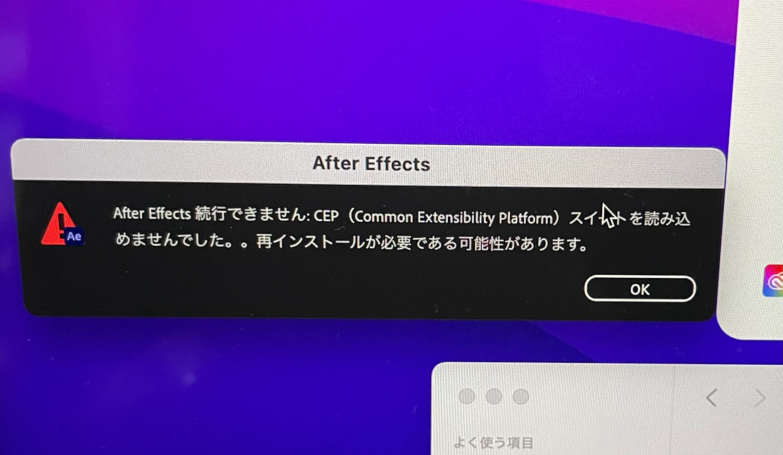 また、AfterEffects2022を開くと、下図のようなエラーが発生しました。