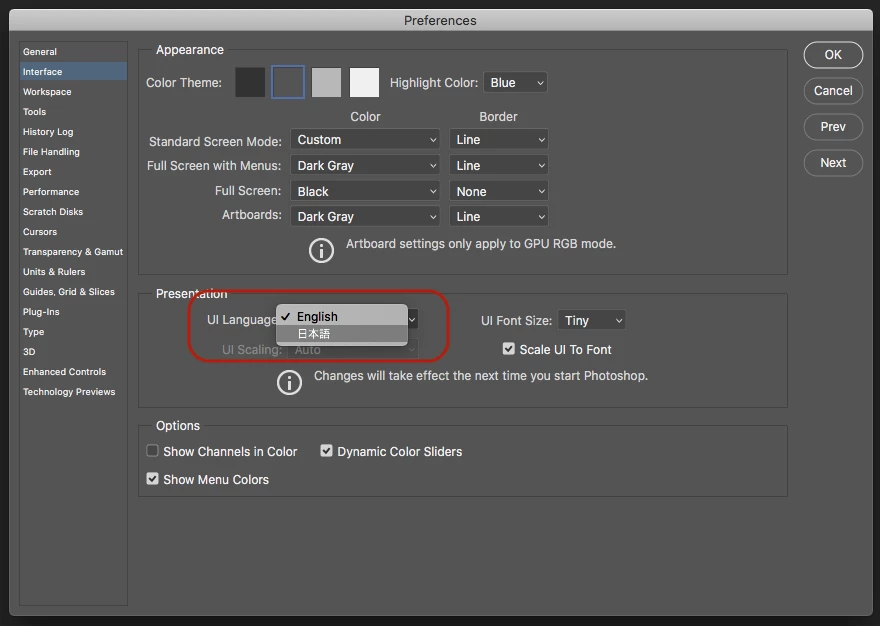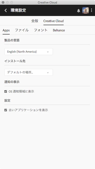 Creative Cloud Desktopの環境設定で製品の言語をEnglishにしてインストールします。