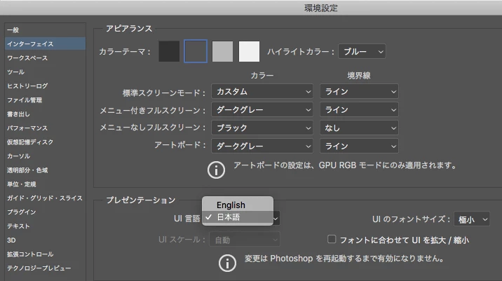 Photoshopはユニバーサル仕様ではないようで、OSを日本語にしても日本語化されません。