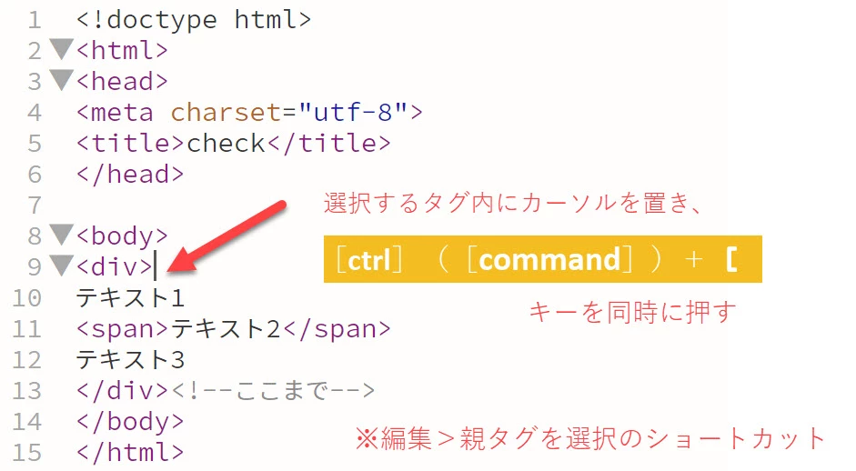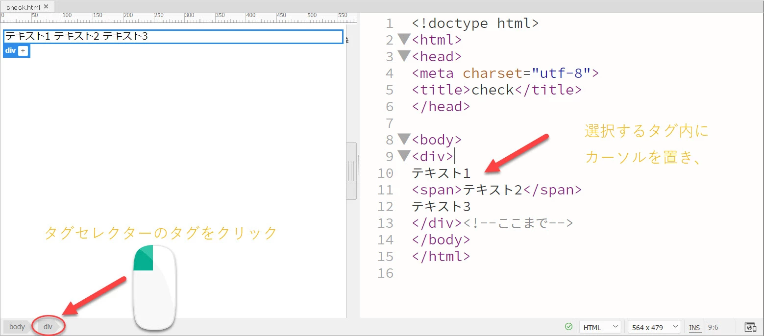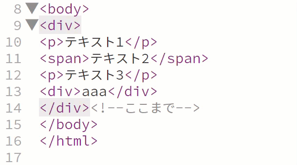 ・<div>~/<div>が選択されている状態から、