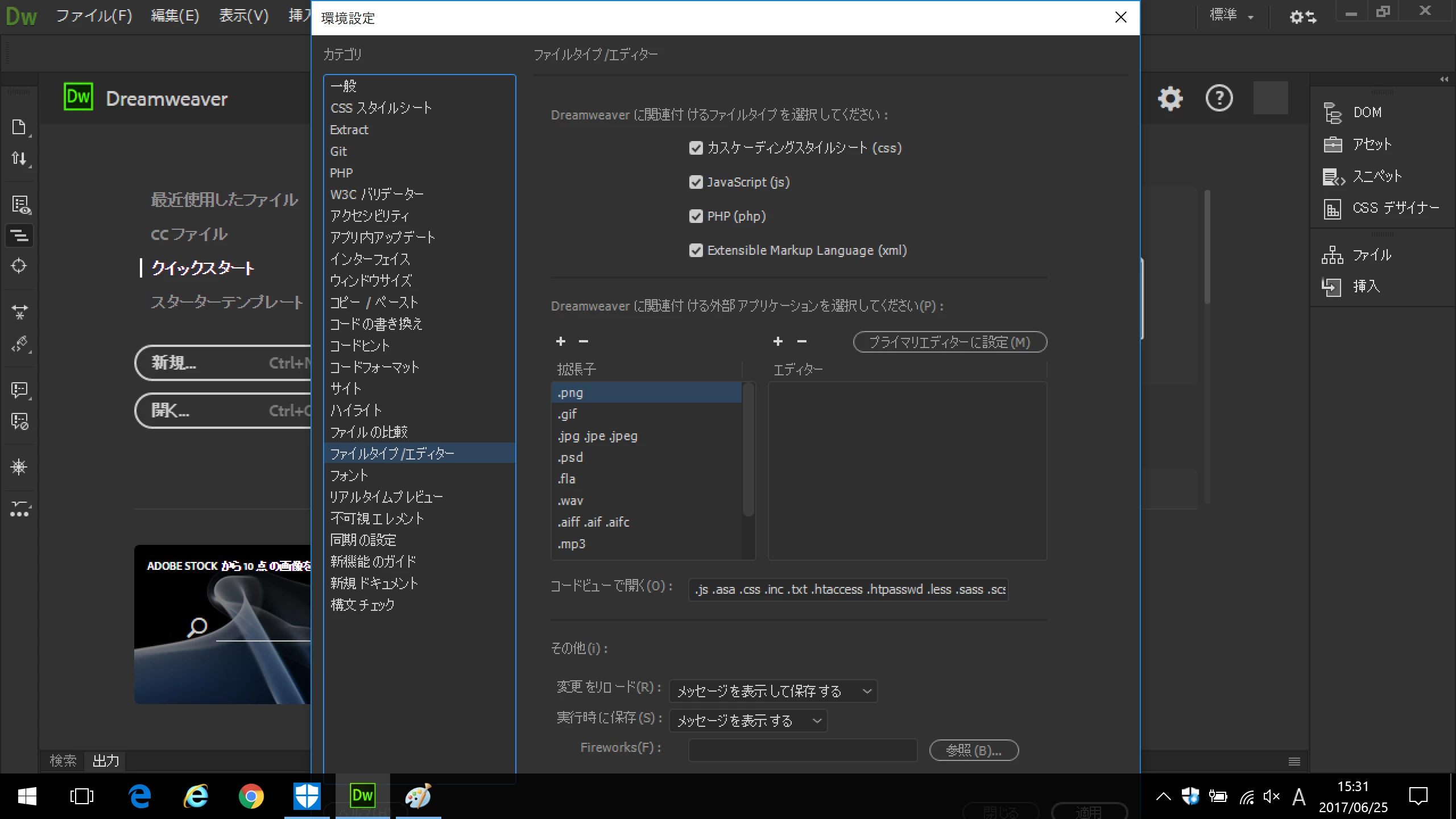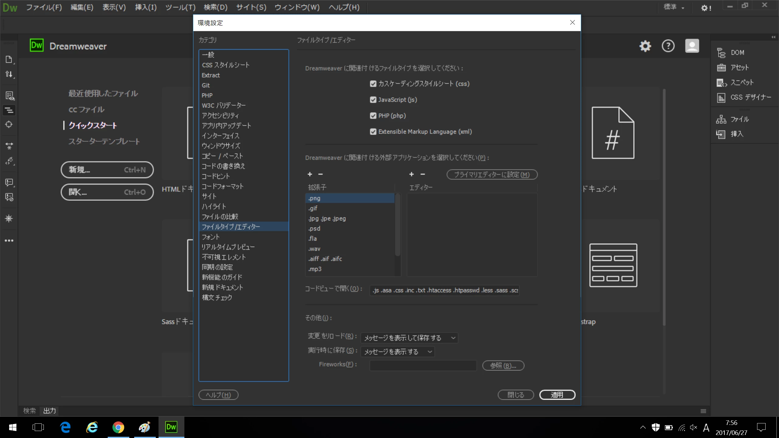 そのためなのか、Dreamweaverの「編集」→「環境設定」ダイアログボックスの中で、「カテゴリ」から「ファイルタイプ/エディター」を選択すると、ダイアログボックスの縦幅が長くなり、結果、Windowsのツールバーまではみ出してしまいます。