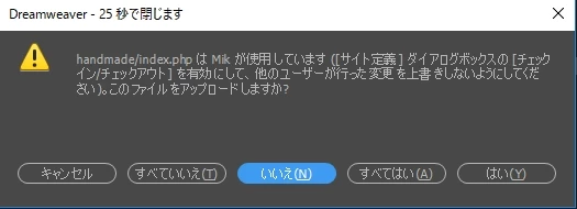 サイト設定でサーバーを選択し、詳細設定タブから「ファイルのチェックアウトを使用可能にする」を選択していますが(※図1)、該当ファイルを開き(「常にチェックアウトしてファイルを開く」を使用しているので、この時点でチェックアウトされています)、F12でブラウザにてプレビューしようとすると、自分が使用しているのに、「○○が使用しています。[チェックイン/チェックアウト]を有効にして、他のユーザーが行った変更を上書きしないようにしてください)。」と出ます(※図2)