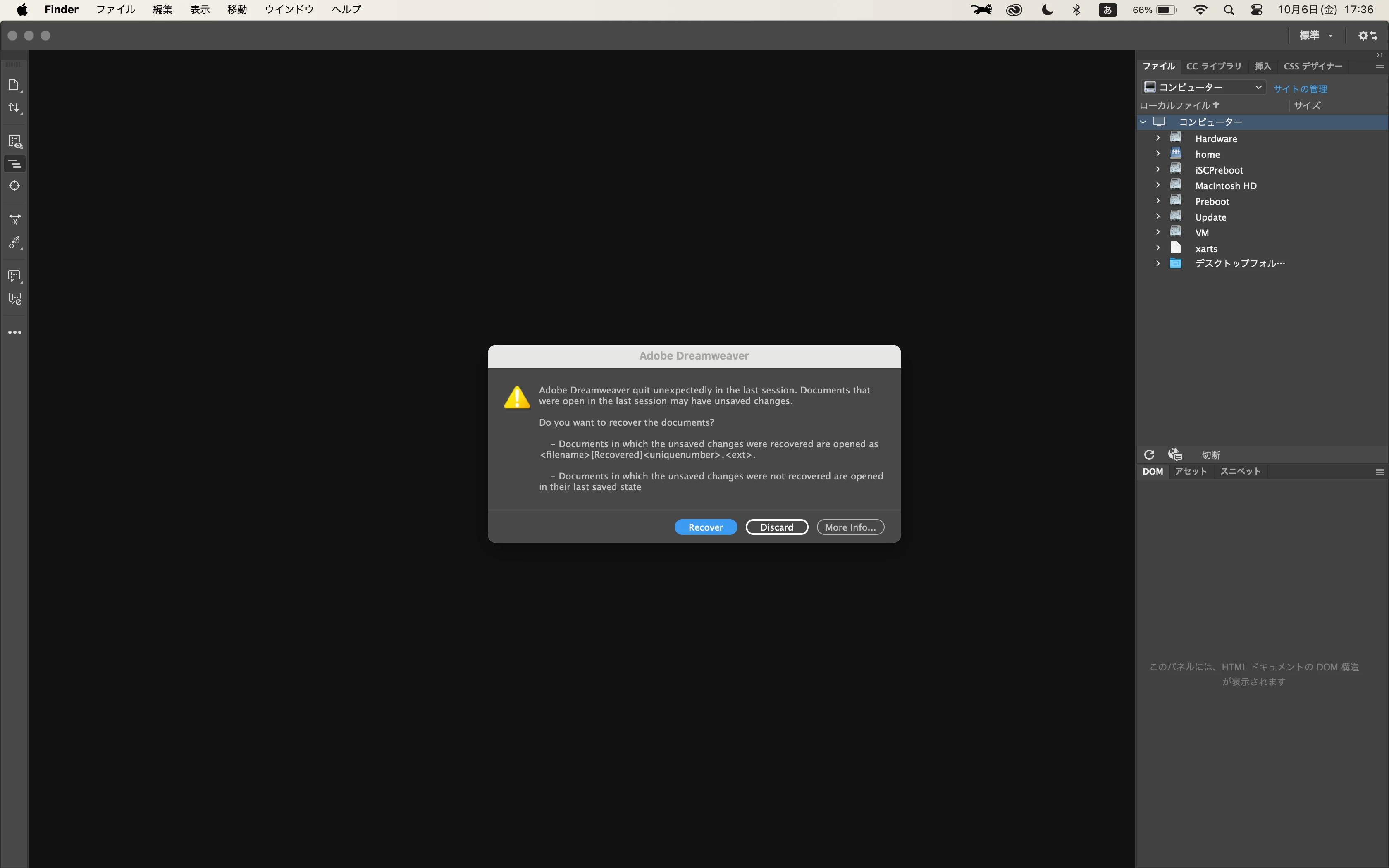 コード作成練習中に虹色のクルクルが急に出現しフリーズしてしまいました。どうすることもできなかったためdreamweaver自体を強制終了しました。