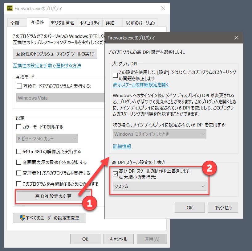 2)表示されたプロパティ画面で「互換性タブ>高DPI設定の変更」ボタン❶をクリック、次の画面で「高DPIスケール設定の上書き」の『高いDPIスケールの動作を上書きします(項目下のリストは“システム”)❷』にチェックし、OKボタンで確定します。