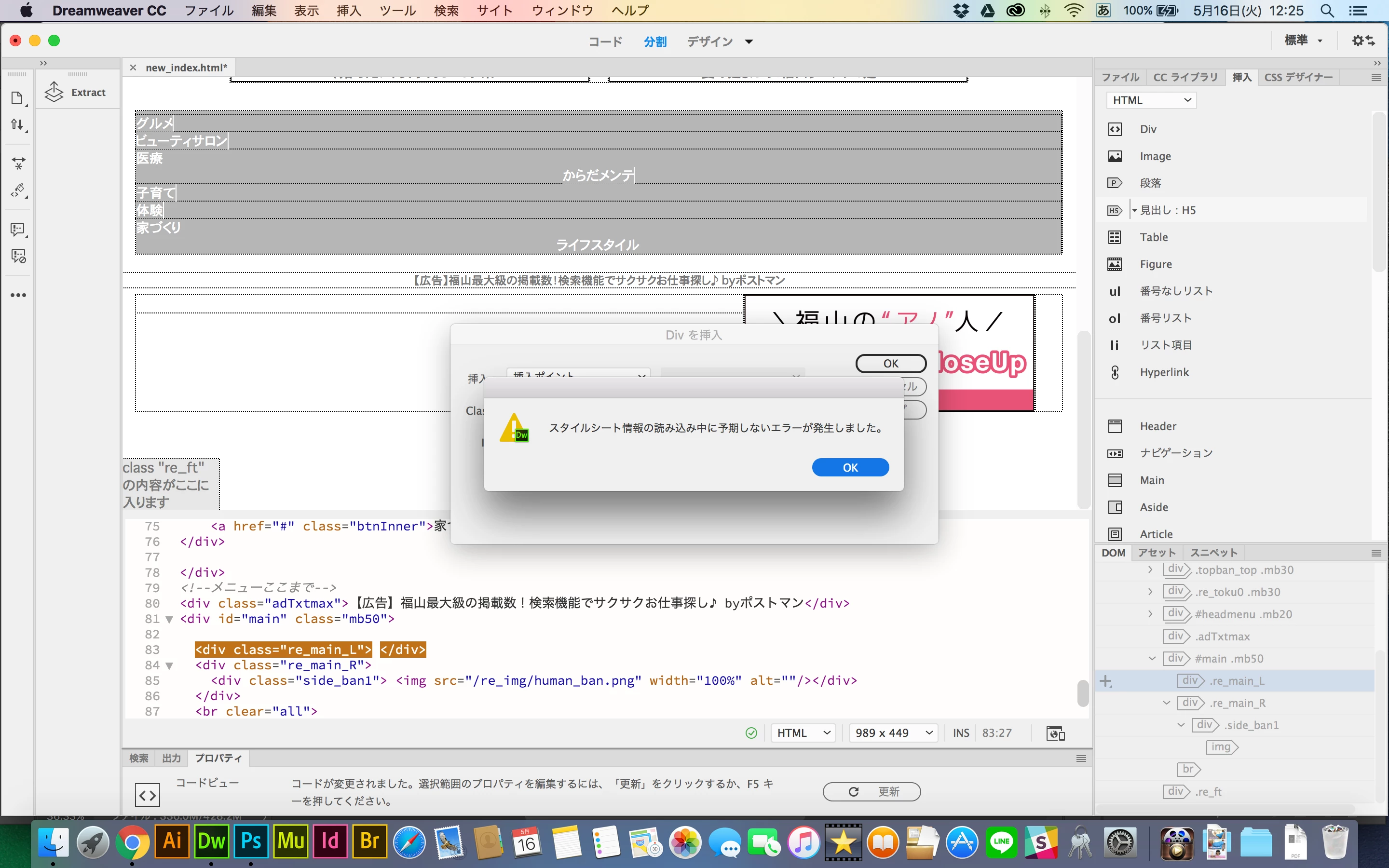 あと、デザインビュー画面上部に出ていたリンクcssの表示も消えてレイアウトもcssが反映されていないように表示されています。