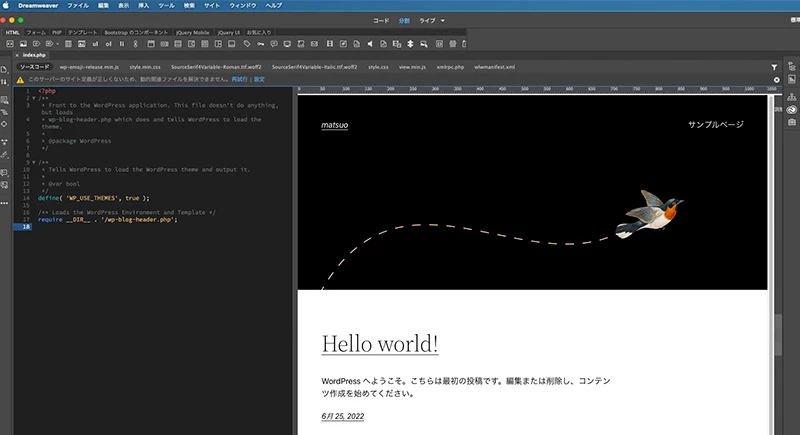 私の場合もコードビューの上部に「サーバー内部のエラーのため、動的関連ファイルは解決されませんでした。」が表示されているのですが、これはおそらくDreamweaverがローカルルートフォルダ内に必要なファイルを見つけられないからだと思います。DreamweaverのコードエディタはPHPのコードを解析して関連ファイルを見つけるわけではないので、プログラム的に呼び出されている関連ファイルは見つけることができません。