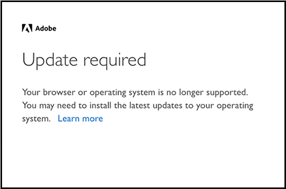ブラウザまたはオペレーティングシステムを更新した後でもこのメッセージが表示される場合は、最新バージョンのアドビ製品を使用しているかどうか、確認してください。