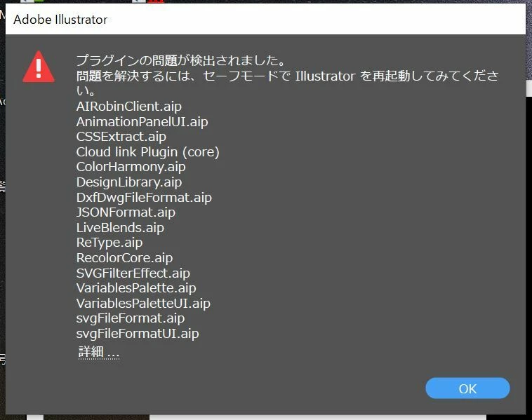 Illustrator を起動すると途中で「プラグインの問題が検出されました。問題を解決するには、セーフモードでIllustratorを再起動してみてください。」のメッセージが表示され、正常に起動できない。