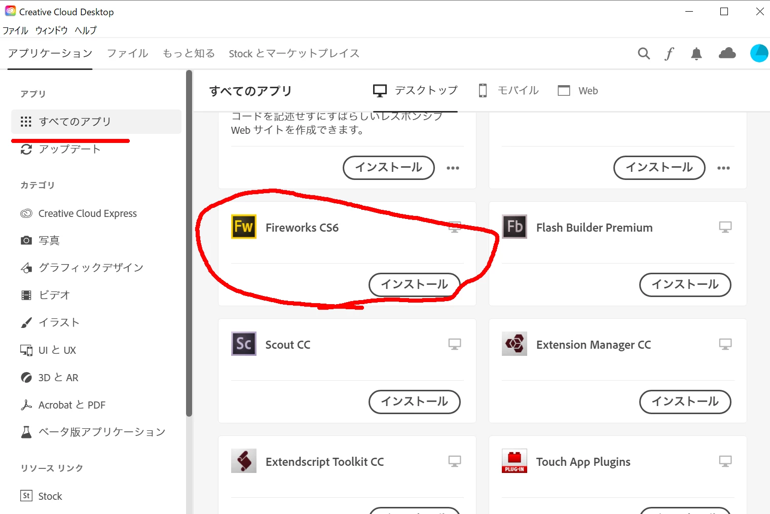 Cleative Cloudeよりfireworksをインストールするため、環境設定でふるいアプリケーションを表示する設定をしてもすべてのアプリに表示されません。