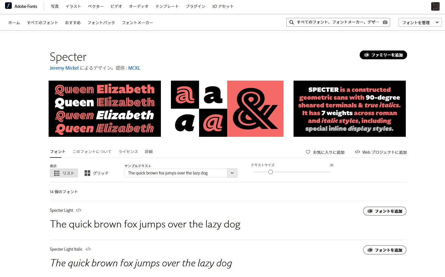 基本的にはAdobe Fontsのサイトに、契約中のAdobe IDで入り、意図するフォントを探したうえで、「フォントを追加」や「ファミリーを追加」のボタンを押すことで、フォントは追加されます。