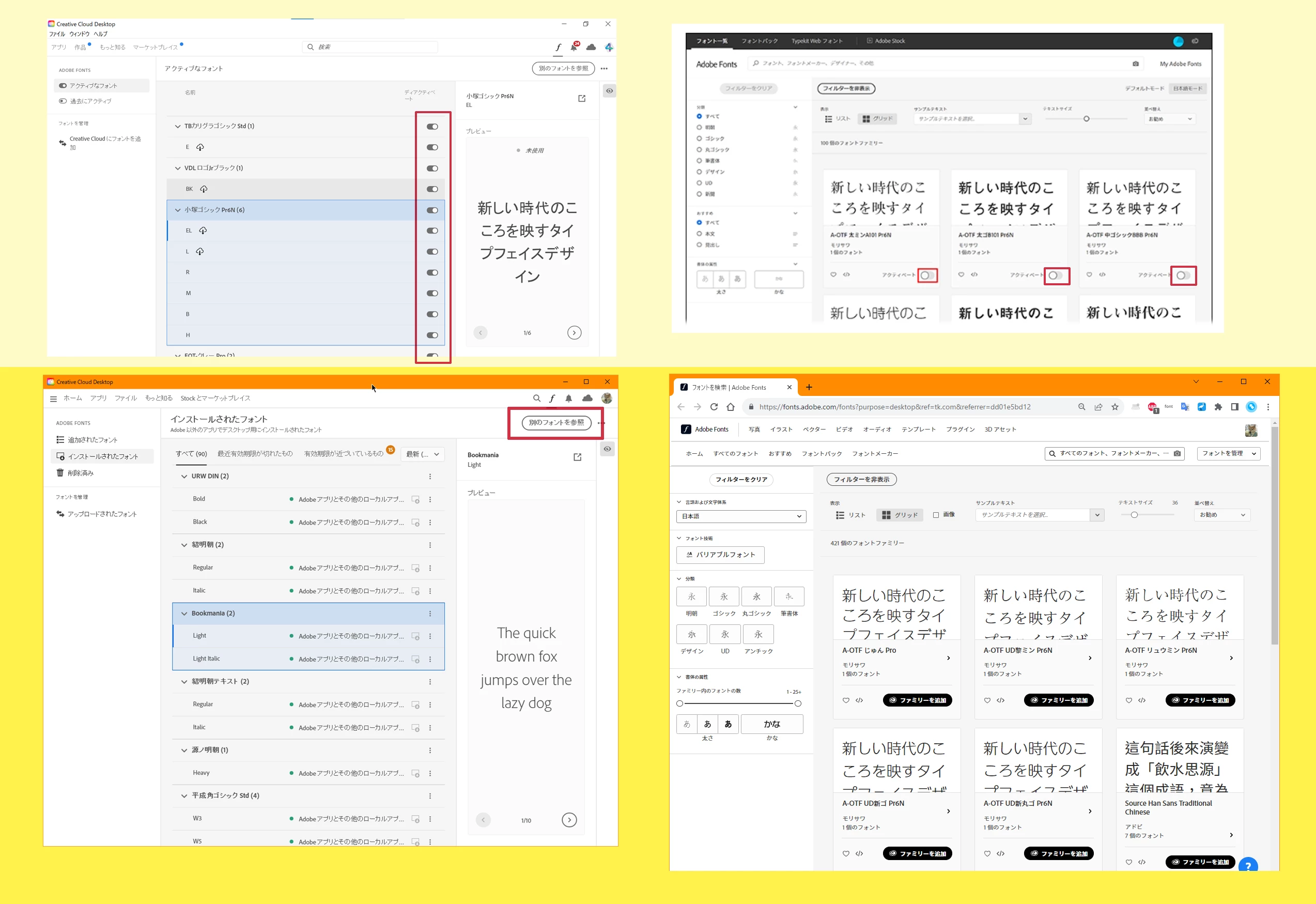 今年の7月よりPrを学習しております。書店で販売している本を見ながら学習しております。「アドビフォントのアクティベートスイッチを入れるだけでフォントメニューに表示され使用できるようになります」とありますが、「ファミリーに追加」は表示されていますが「アクティベートスイッチ」というものが見当たりません。ネットで検索しても、CreativeCloudデスクトップアプリを開き、右上のフォントアイコンfを選択、次に「フォントを参照」を選択します。」・・・とありますが、フォントを参照というボタンや文字が見当たりません。テキストは2021年用です。「ファミリーを追加」でインストールして使用していますが、インストールしなくてもAdobe製品(例えばPrやPs)で使えるようにするにはどうすればよろしいのでしょうか。
