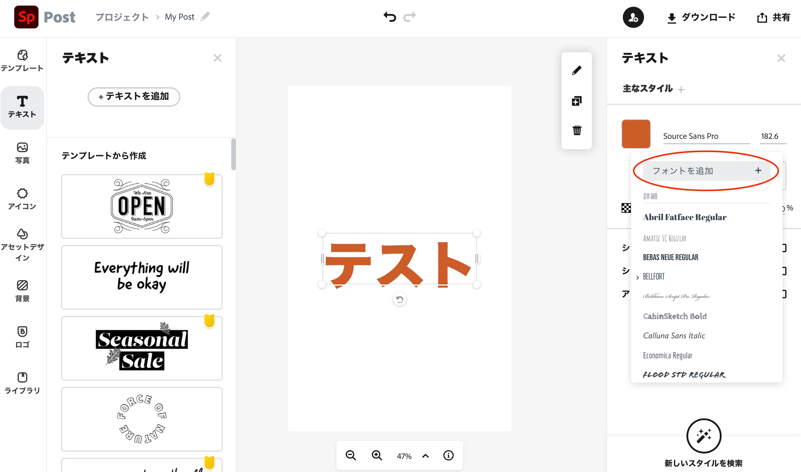 [Adobe fonts を参照]>Adobe FontsのWebサイトへ飛ぶ>Sparkで使いたいフォントを選ぶ>すでにアクティベート済みのフォントの場合は一度アクティベート解除後再度アクティベート>未アクティベートフォントであればアクティベート>Sparkのフォントリストに反映されているのを確認