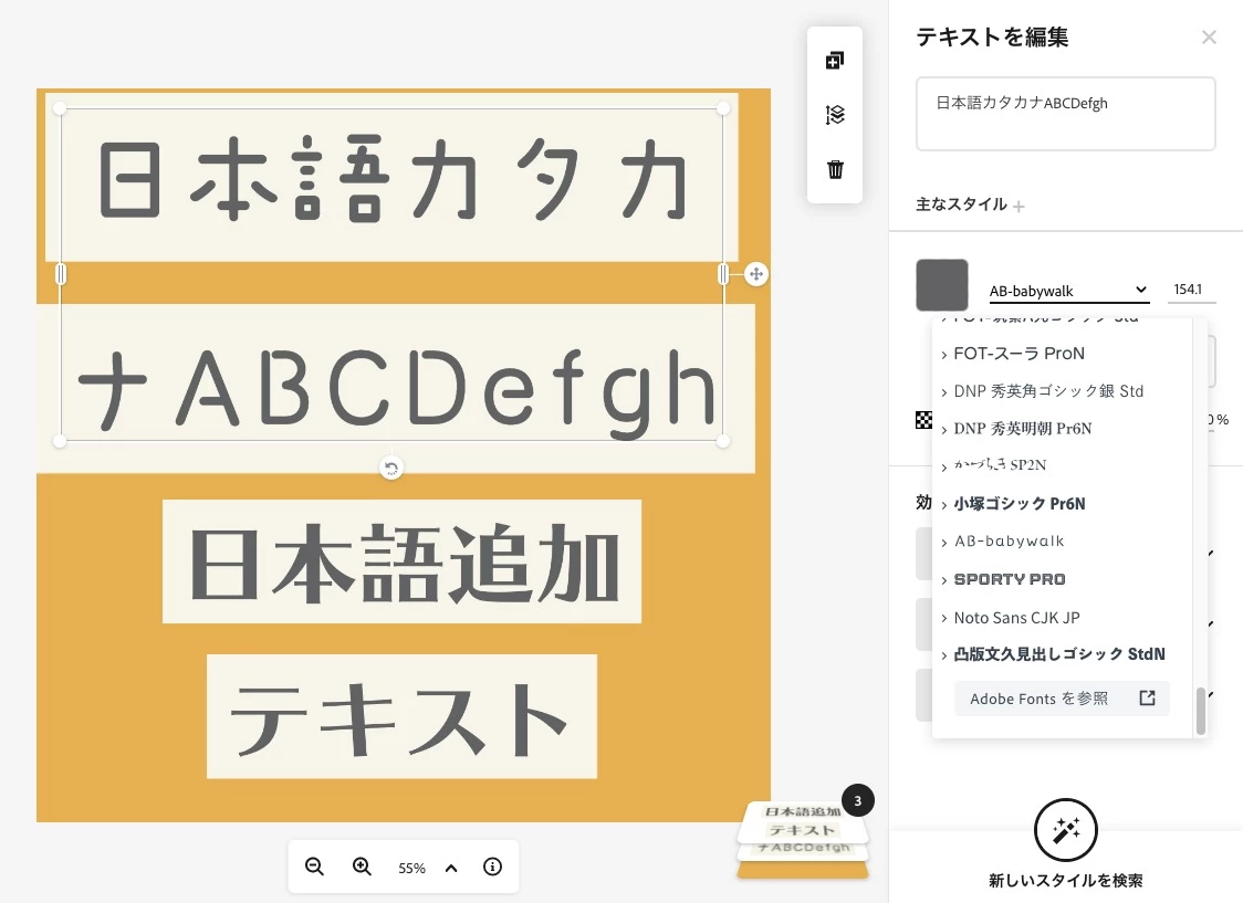 フォントメニューの最下部に「Adobe fonts を参照」ボタンがありますね。