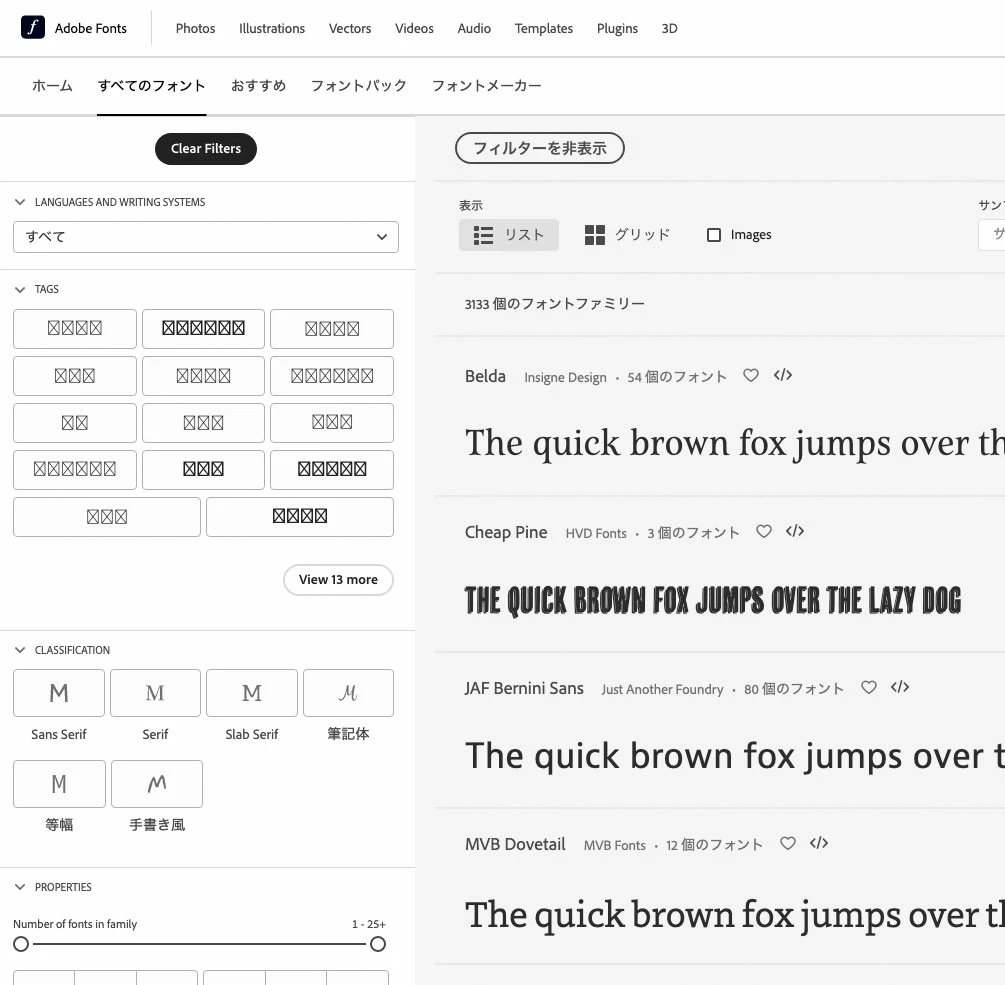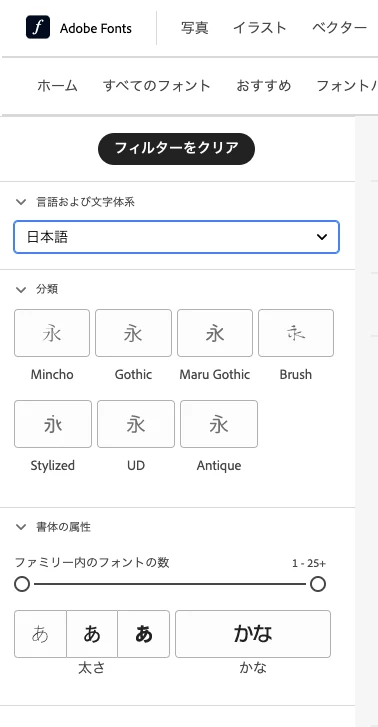 フォントを検索する際、画面左側のフォントを絞り込むフィルターのタグ(TAGS)の選択肢が化けて表示されます。(全て□の中にXの文字で表示されます。)ここは通常は「タグ」という見出しで、「ホリデー」や「カリグラフィー」といった選択肢が並びますが、見出しは英語の「TAGS」となり、全ての選択肢が文字化けている状態です。タグ以外のフィルター(分類、書体の属性)の見出しも英語にはなってしまいますが、それらの選択肢はちゃんと表示されます。