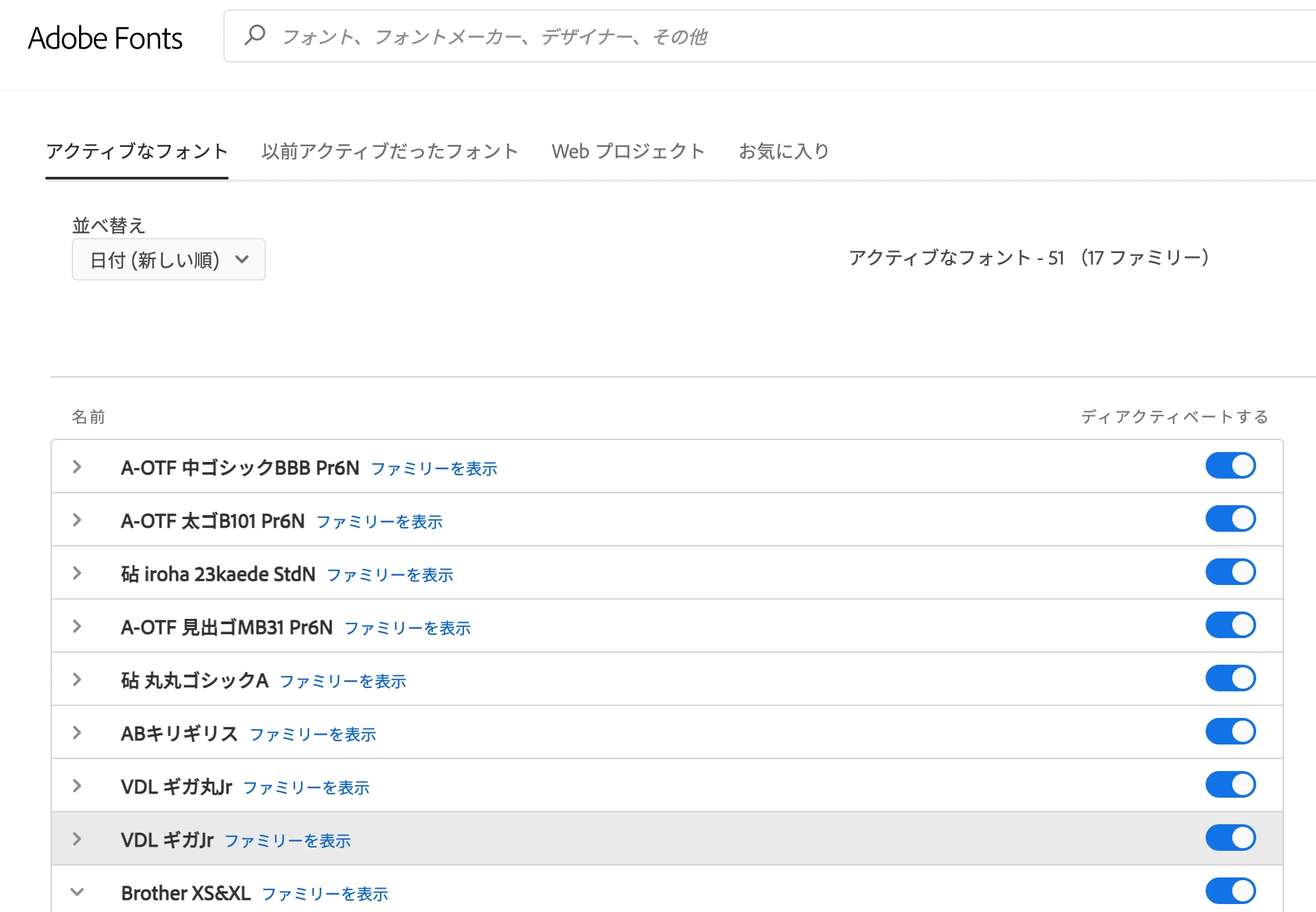 ブラウザのMy Adobe Fontsでは、過去にアクティベートしていたフォントはそのままアクティベート状態で表示されています。