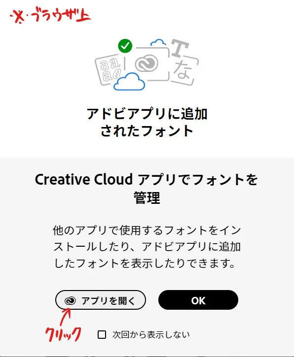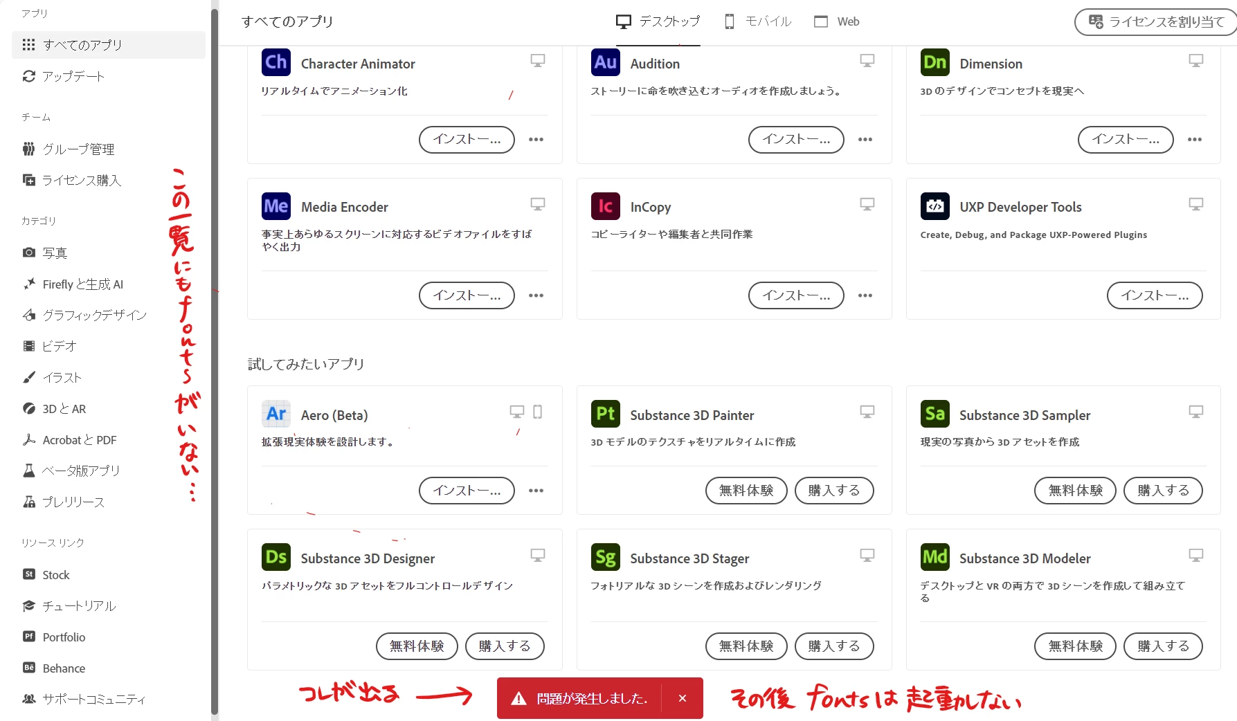 ブラウザでadobe fontsの管理・操作はできていそうです(お気に入りにした記憶がないフォントがお気に入りされてたりしますけど)が、ブラウザ内でフォントをアクティベートするたびにCCアプリでの管理を促され、言われたとおりにCCアプリに飛ぶと「問題が発生しました。」とだけ表示されfontsの管理画面まで到達できません。(添付画像をご確認ください)
