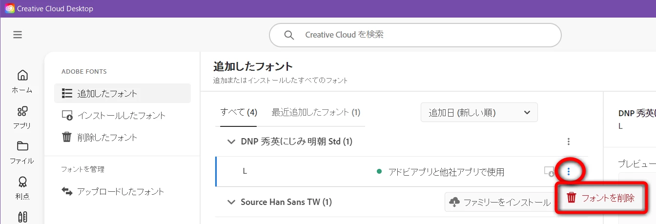Adobe Fonts からインストールしたフォントを「アドビアプリのみで使用」に変更したい