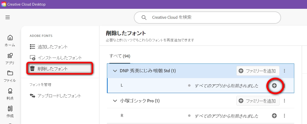 2. CreativeCloudのフォントのページを開き、以下キャプチャの雲マークから、フォントをインストール