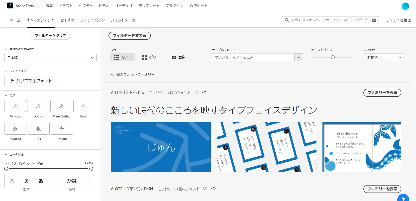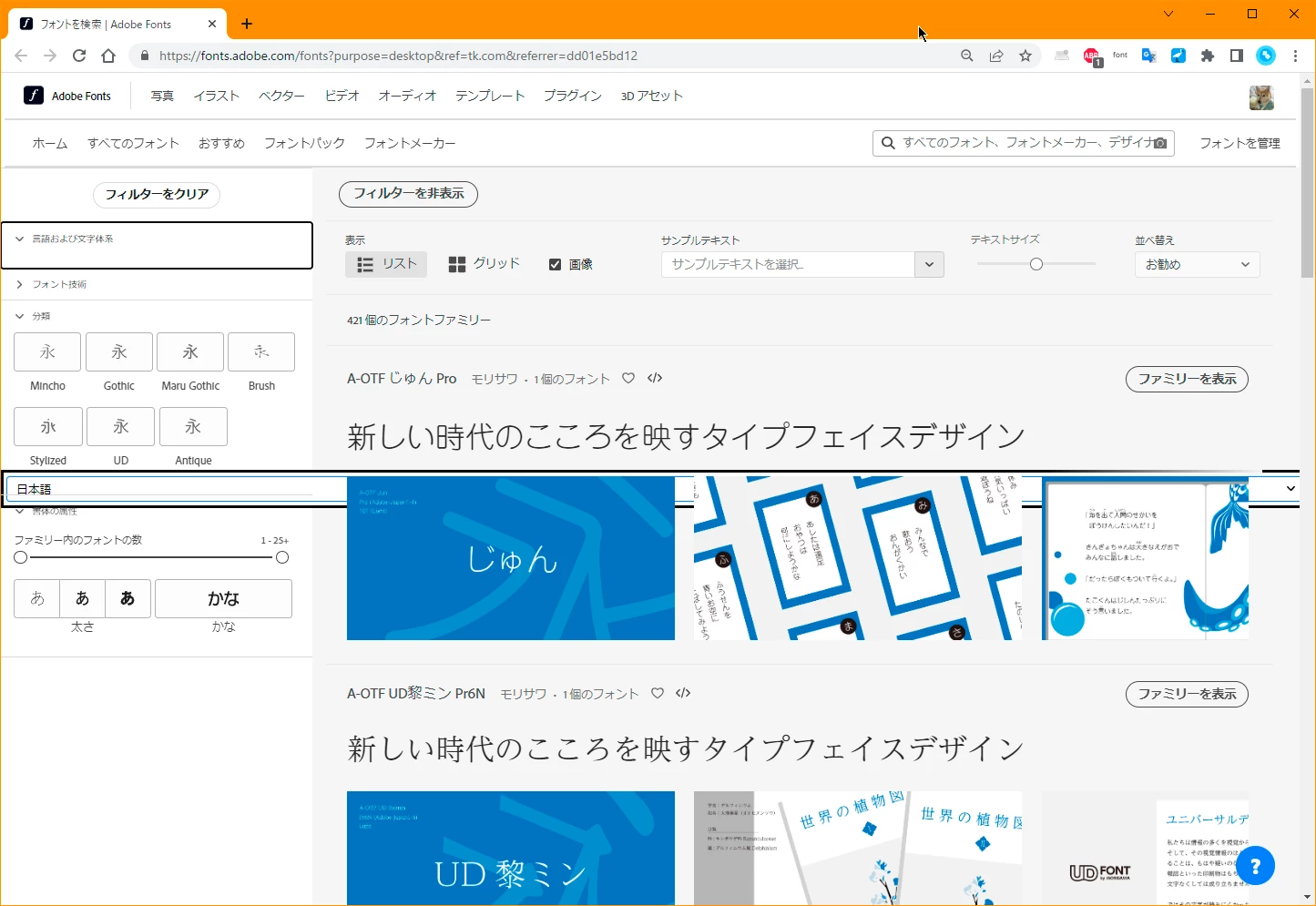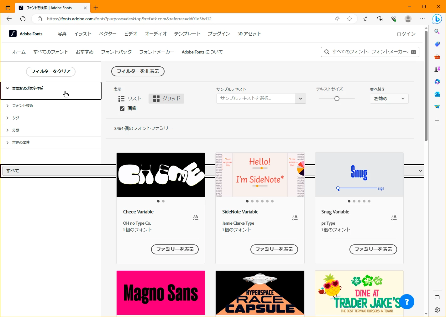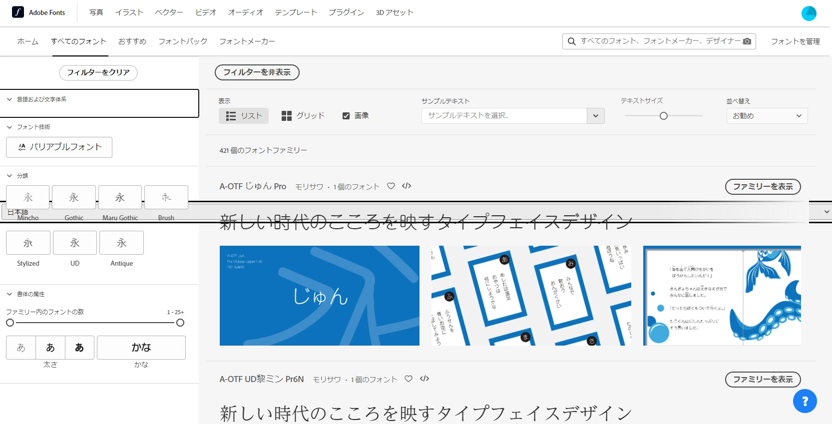フォントを検索の左側「言語及び文字体系」のタブを選択すると表示がおかしくなり