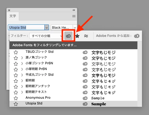 フォントメニューにAdobe Fontsだけを表示するボタンがありますので、そこをクリックすれば確実にわかります。