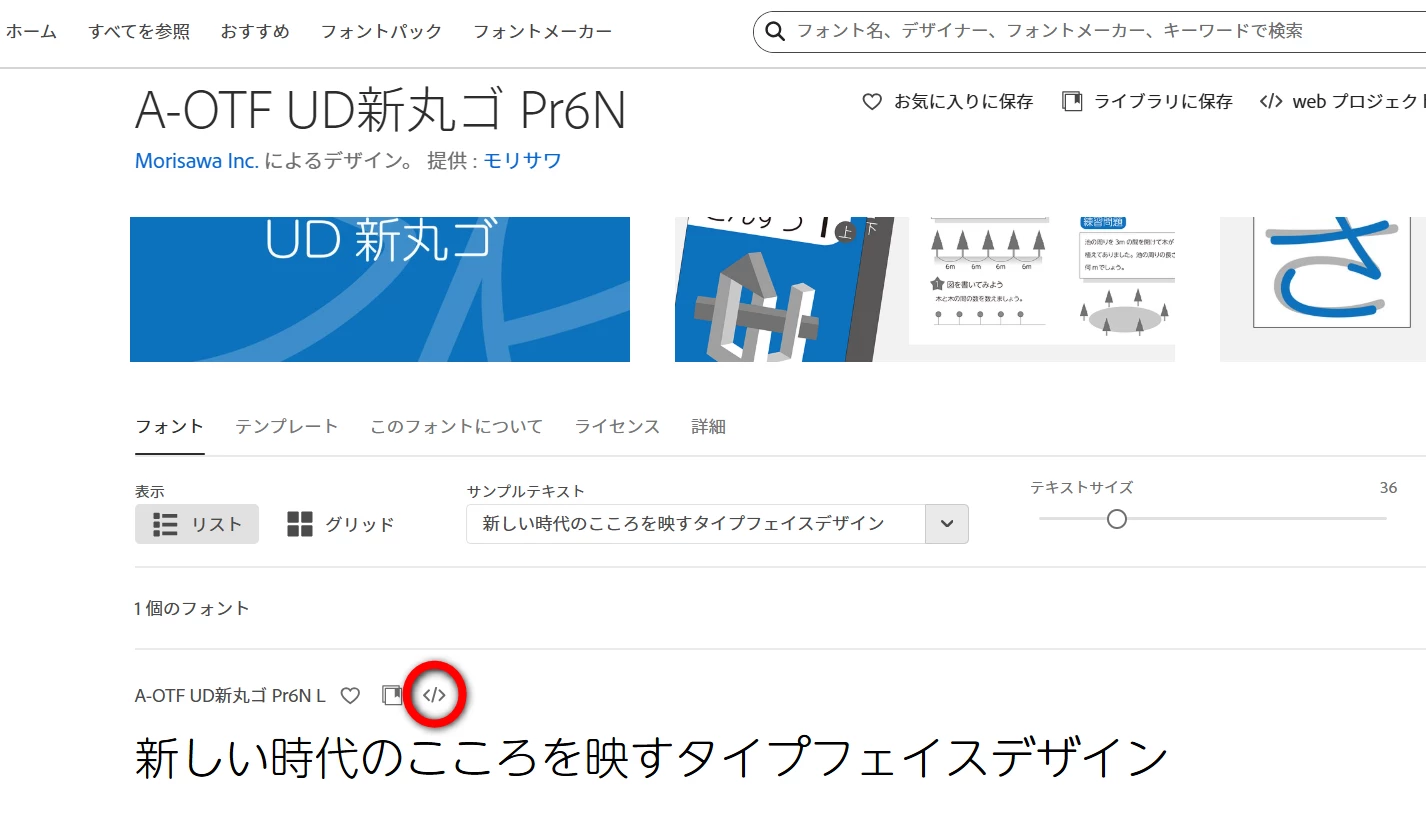 まず目的のフォントのページに行きます(例:A-OTF UD新丸ゴ Pr6N L)。