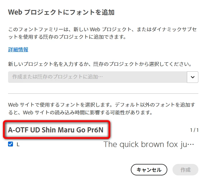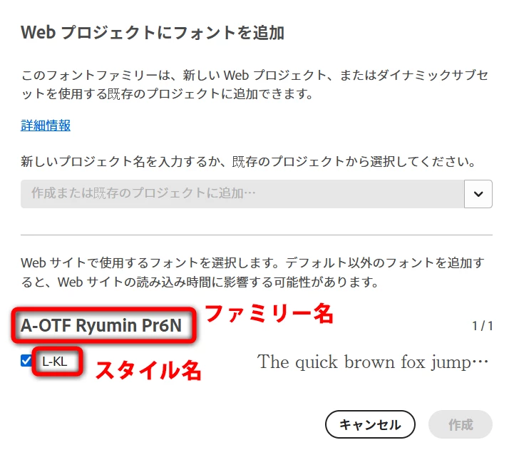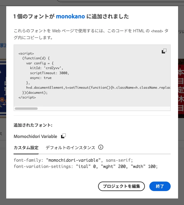 Adobe FontsのフォントをWebフォントで使う時は、規定の手順に沿って「Webプロジェクト」に登録します。そうすると専用の <script> が発行され、その同一画面に font-family も掲示されます。