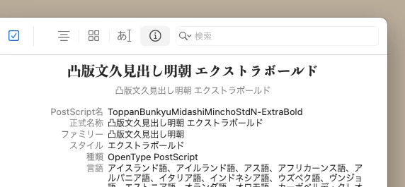 Font bookを起動して、リストの「凸版文久見出し明朝」を選択し、メニュー「編集 > “凸版文久見出し明朝”ファミリーをダウンロード」を選択してください。これで使えるようになります。