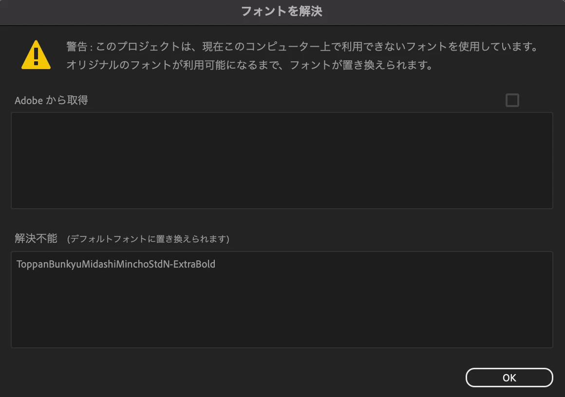 Premiere proで利用できずフォントが存在しないような添付のエラーが発生していた。