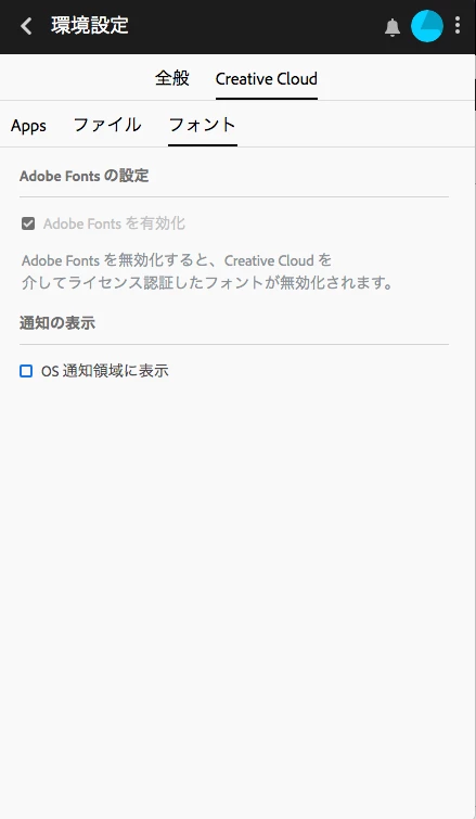 ・環境設定の「Adobe Fontsを有効化」にチェックが入っていますが、グレーアウトしていて特に解除することはできません。(画像添付)