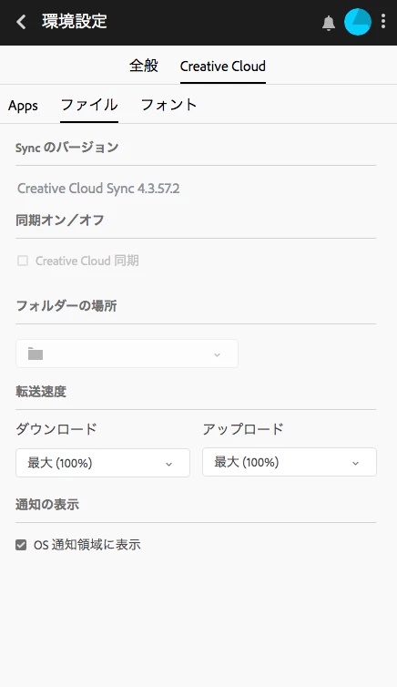 ・「Creative Cloud同期」はグレーアウトしていてチェックが入っていません。