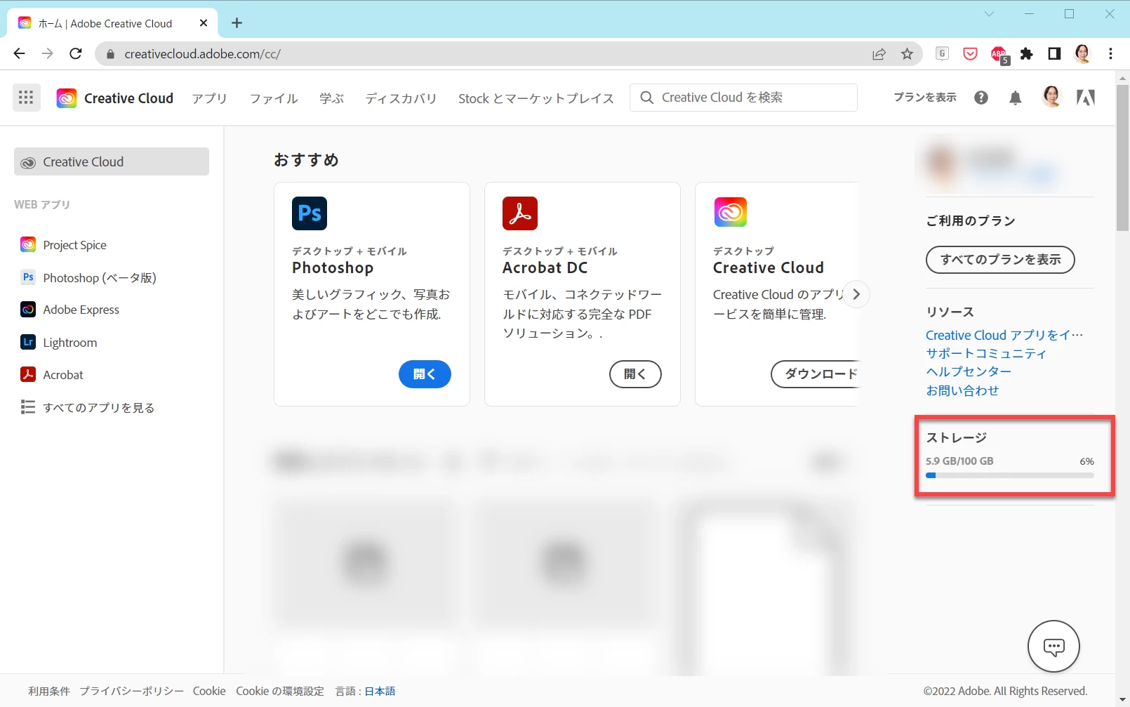 ウェブ版 Creative Cloud( https://creativecloud.adobe.com/cc/ )に、プランに契約中のアドビアカウントでログインすると、右側のストレージ(↓スクショの赤枠部分)に、契約中のストレージ容量が表示されます。