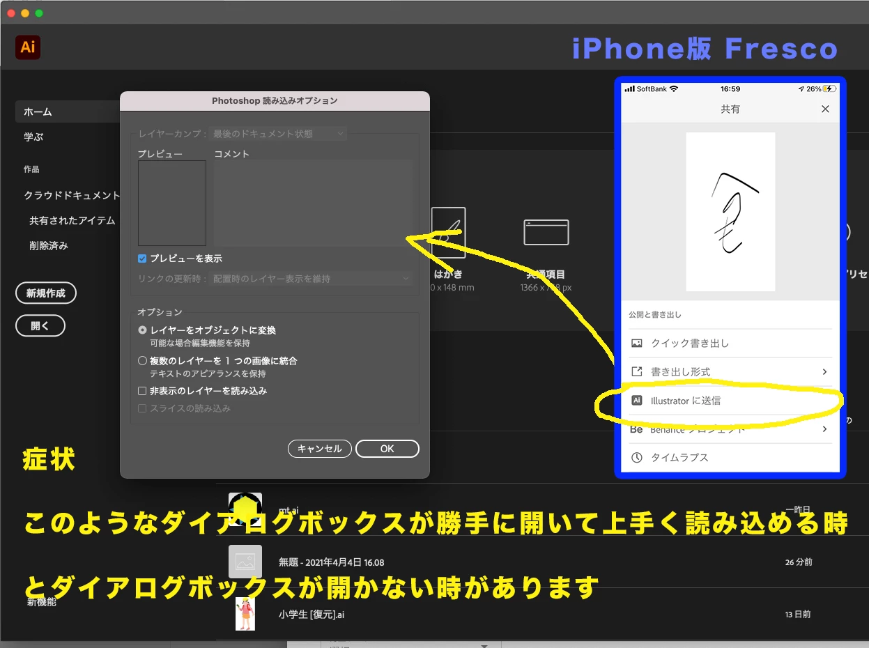 iPhone版Frescoで作った画像をPC版Illustratorに送りたいのですが、上手く行く時といかない時があります。