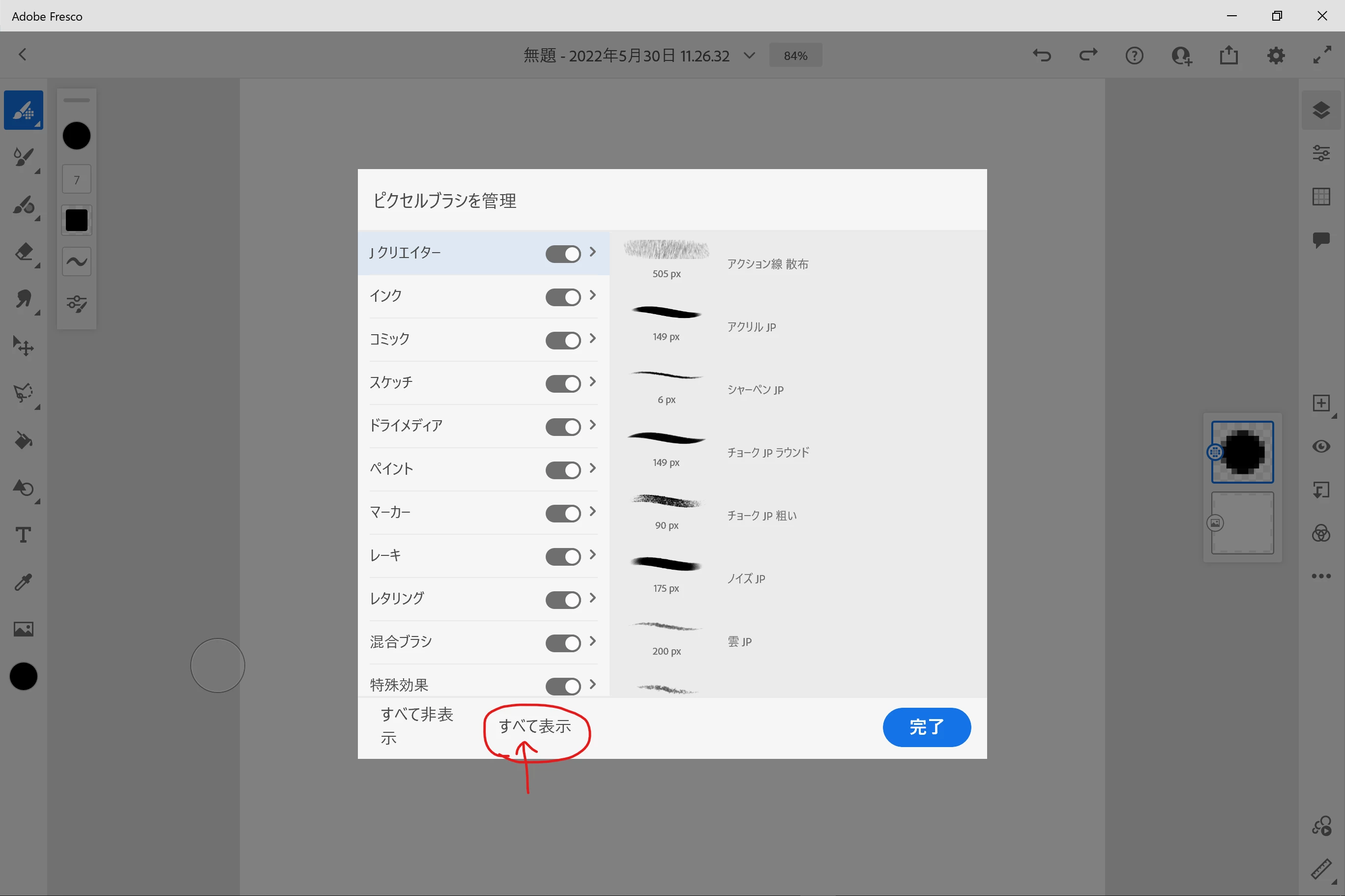 赤く印をした「すべて表示」をクリックすると、ブラシが表示(使える状態)になり、その隣の「すべて非表示」をクリックするとブラシが非表示(使用不可になり、この画面を閉じたあとにツールから消えます)になります。