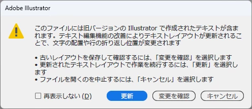 「このファイルには以前のバージョンのillustratorで作成されたテキストが含まれています。」と、毎回表示されます。