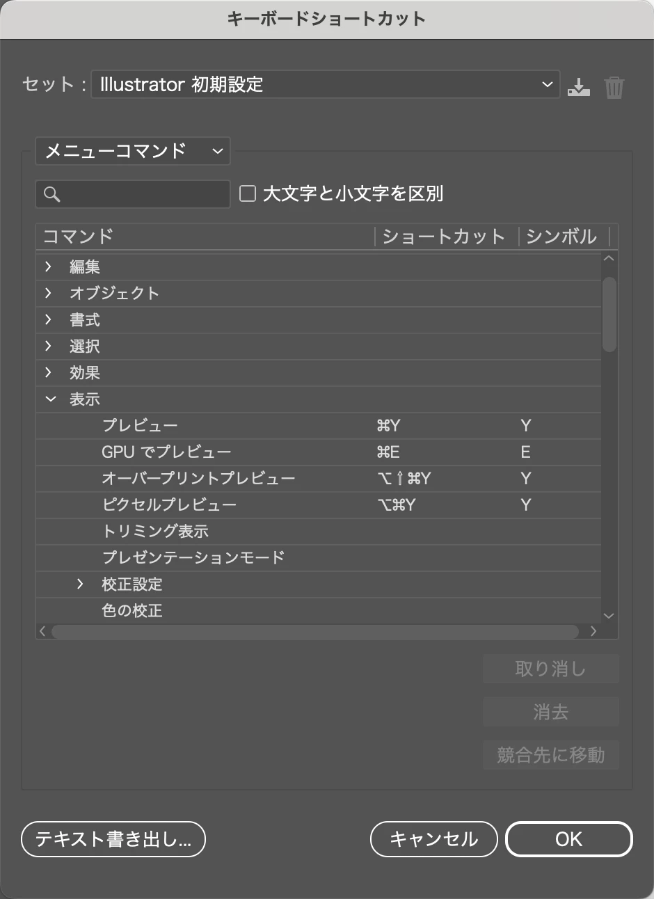 アウトラインとプレビューのショートカットはともにCommand+Yで、ショートカット設定のほうではプレビューのほうだけが項目として表示されるようです。