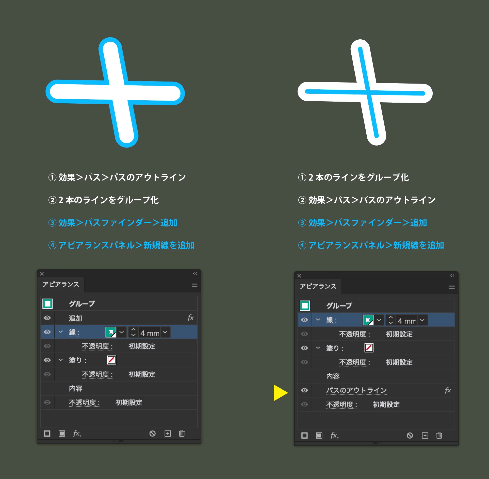 しかしながら,「グループ化→パスのアウトライン→追加」と「グループ化→追加→パスのアウトライン」は,アピアランスの構造が同じになるんですよね。