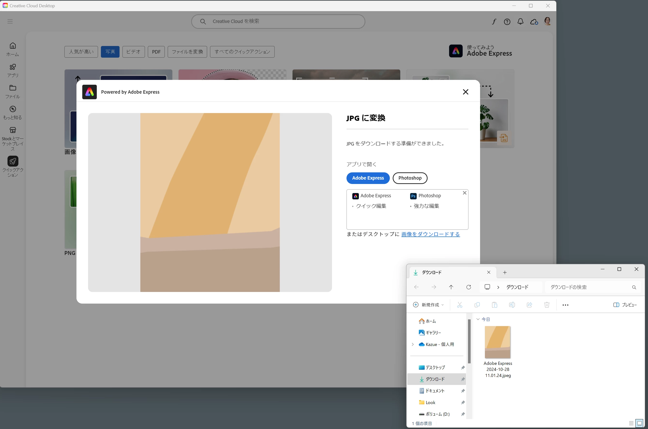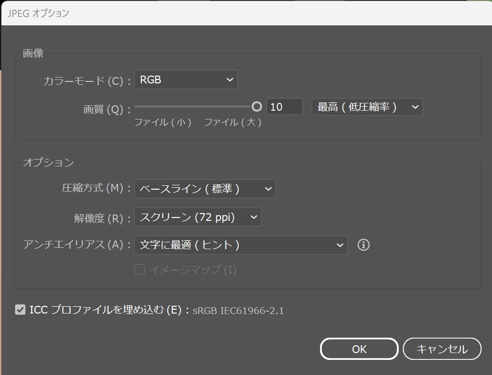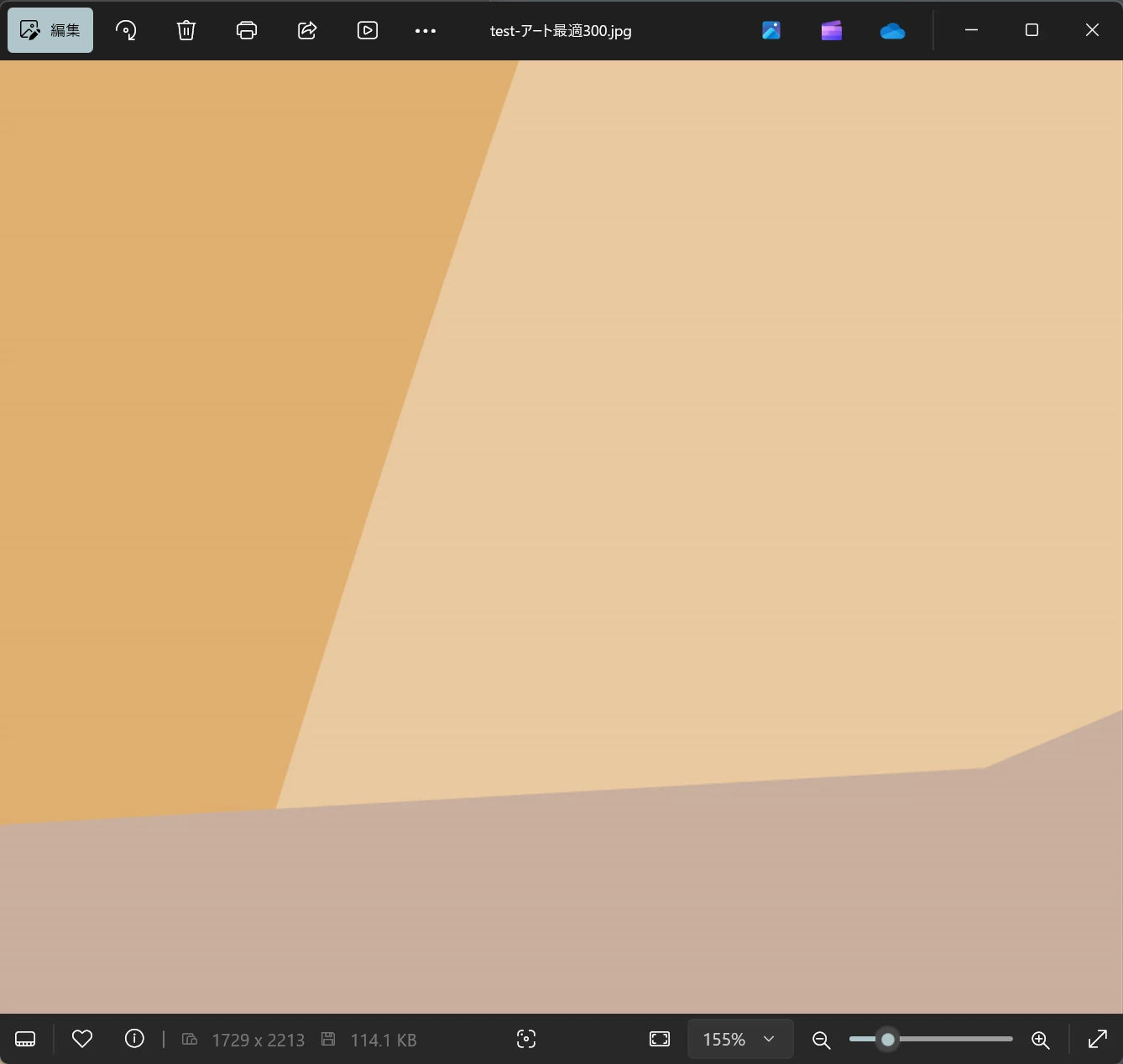 ちなみにさっきは書かなかったのですが、IllustratorからPNG形式で書き出して、“Creative Cloud Desktop”アプリの、「クイックアクション>写真>JPGに変換」で作ったJPEG画像なら、フォトでもわりとマシに見えたりしました。毎回うまくいくわけではなさそうですが、アプローチをいろいろと試してみるのもいいかもと思いました。